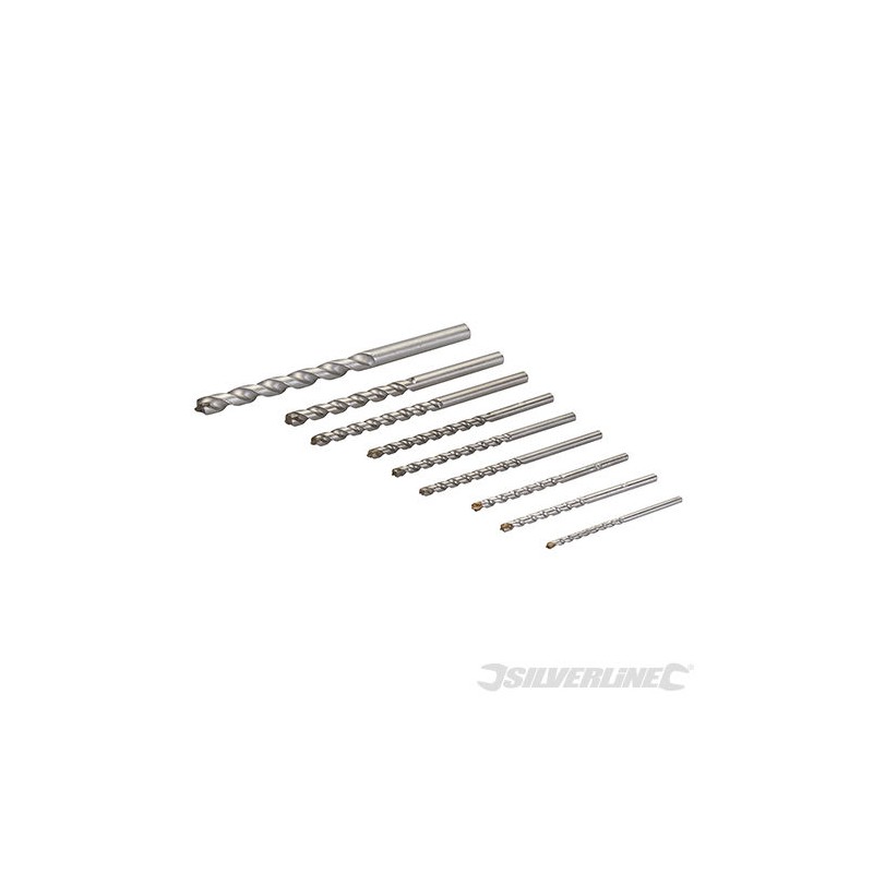 Tungsteno punte in metallo duro.Per uso generale foratura nell maggior parte dei materiali di muratura.Set contiene 4, 5, 5,5, 6, 6,5, 7, 8, 10 e 12 mm. 4.0 - 12.0 mm